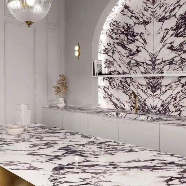 Across the UK, designers and homeowners are moving towards expressive surfaces that still feel considered and timeless. Calacatta Viola porcelain answers this demand by combining bold veining with controlled composition.