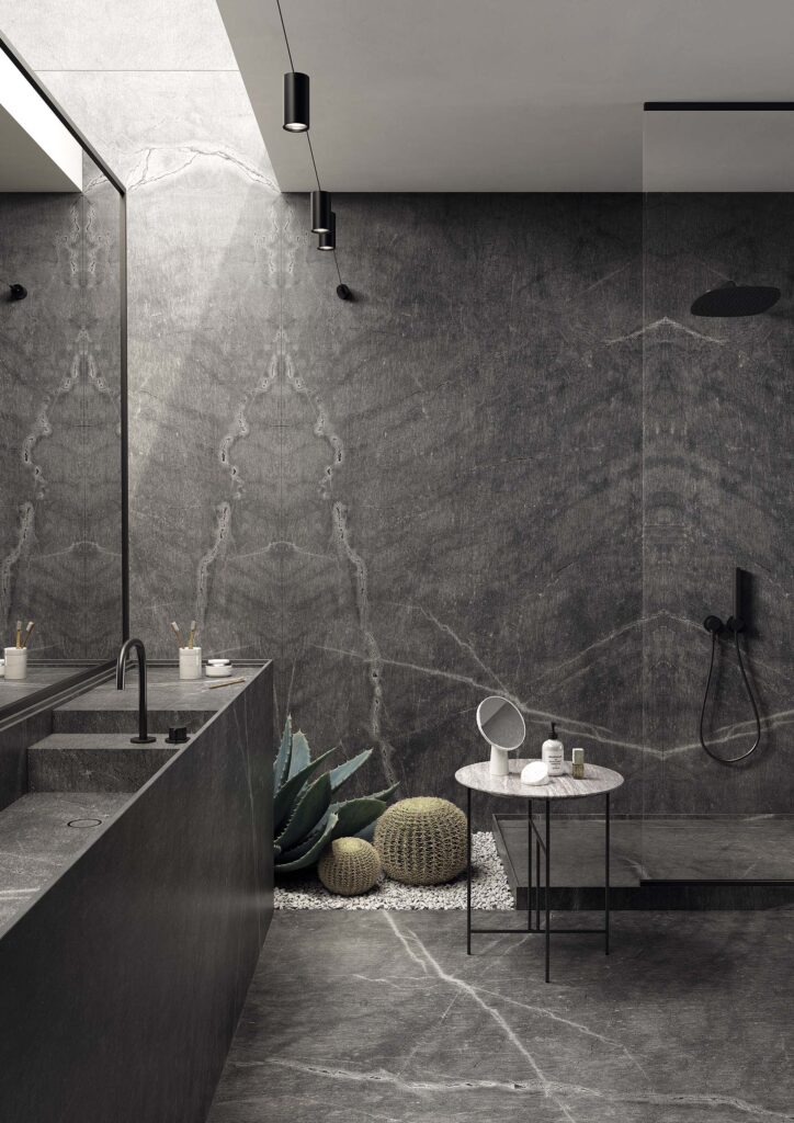 Large format porcelain slabs are available in a wide range of finishes, including stone, marble, concrete, and mineral effects. This allows designers to create calm, neutral spaces or bold statement bathrooms without overwhelming the room.